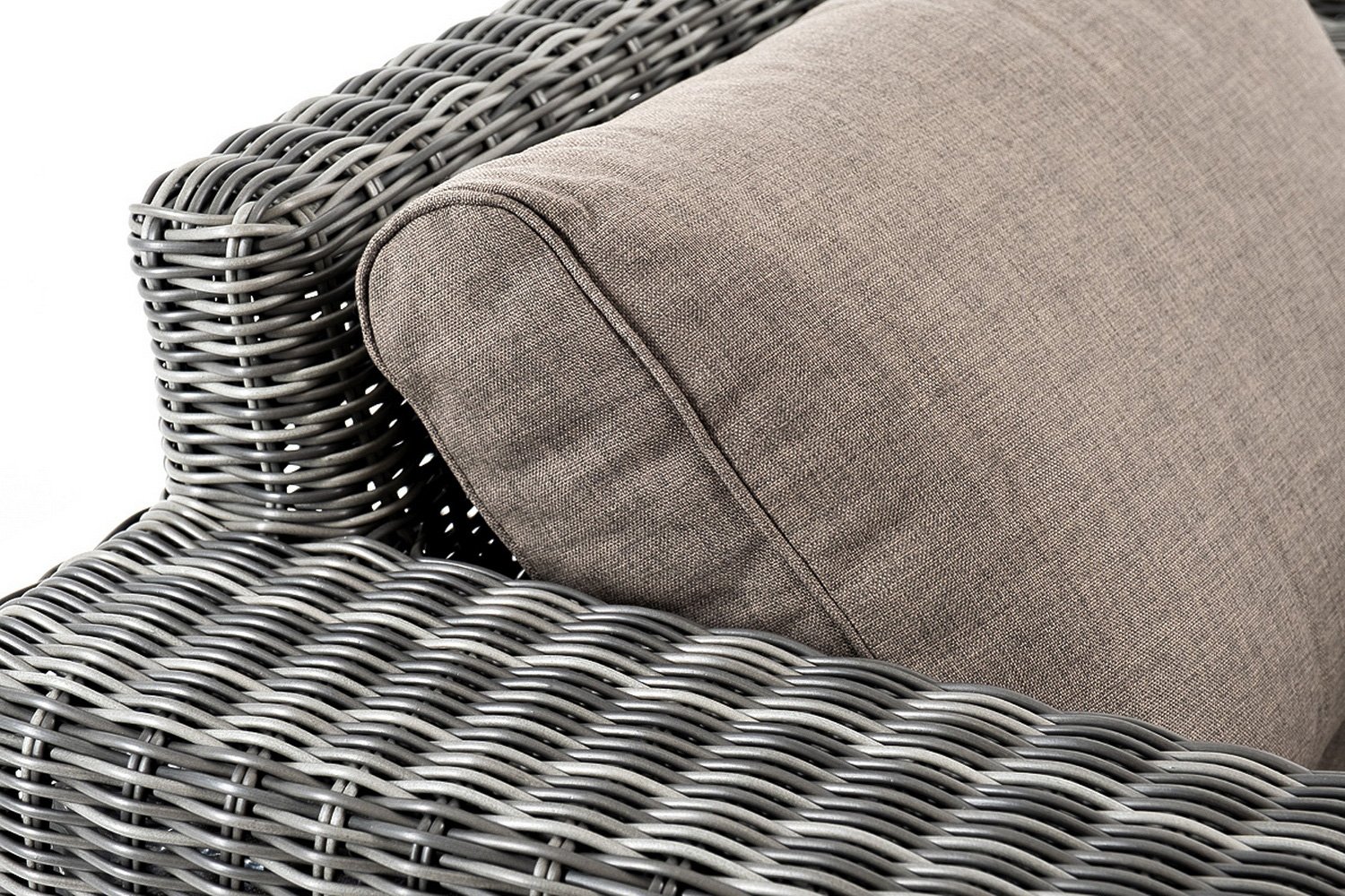 Кроме того, у каждой подушки есть съемный чехол из 100% полиэстера, который легко очищается от загрязнений простым протиранием тряпкой. Полиэстерная ткань чехлов является водонепроницаемой, прочной и плотной, не подвержена негативному влиянию погодных условий и перепадов температур. Все чехлы имеют серый цвет в соответствии с общим дизайном дивана.